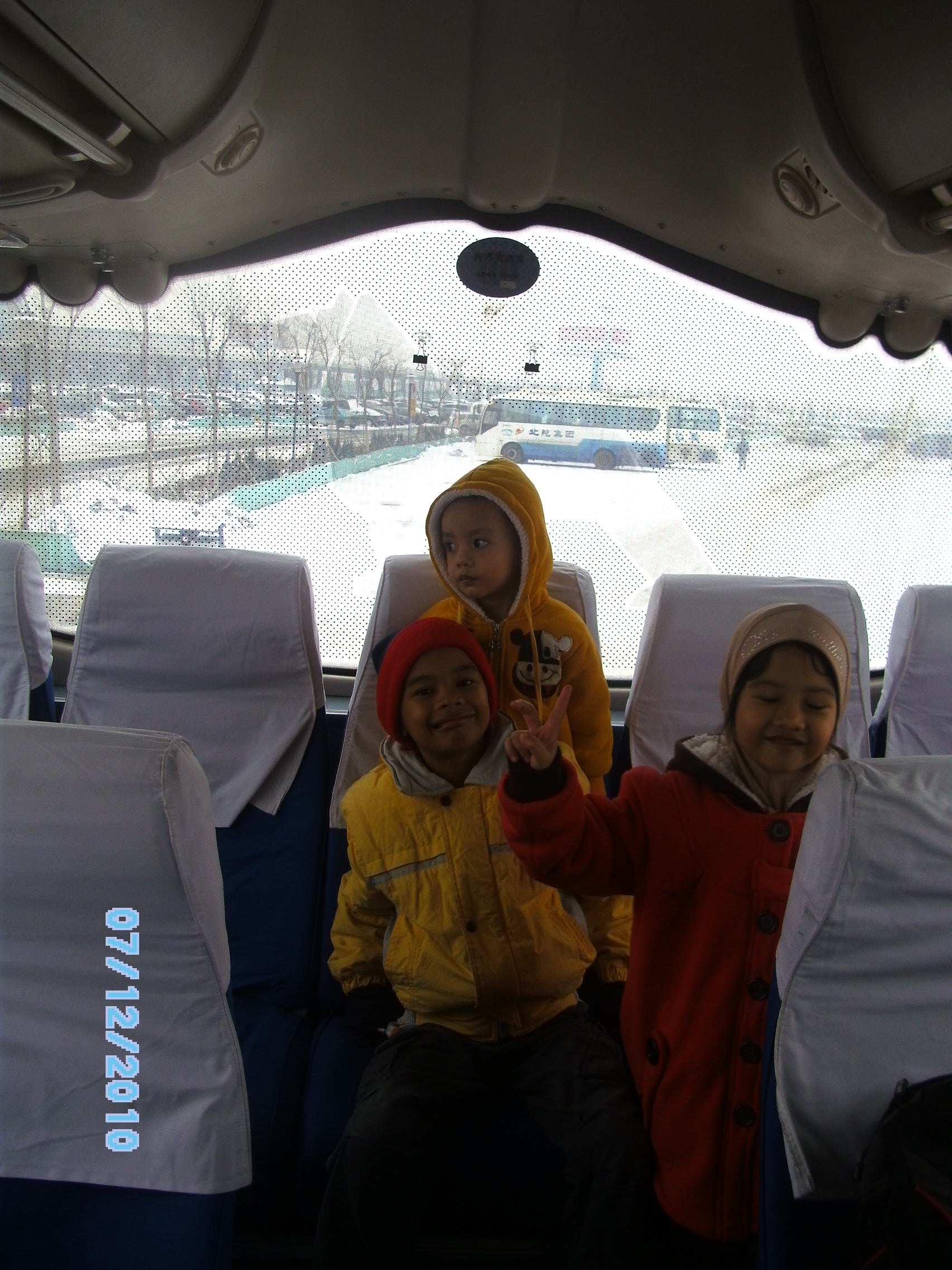 Anak-anak tertidur lagi. Alat pemanas dalam bas tidak berfungsi. Kasihan anak-anak yang kesejukan. Pakaian mereka sebenarnya tidak cukup dengan realiti suhu waktu itu yang di bawah 10 c. Saya dan suami membuka ‘winter coat’ masing-masing dan menyelimutkan mereka. Kemudian saya berjalan ke sana ke mari untuk memanaskan badan.
