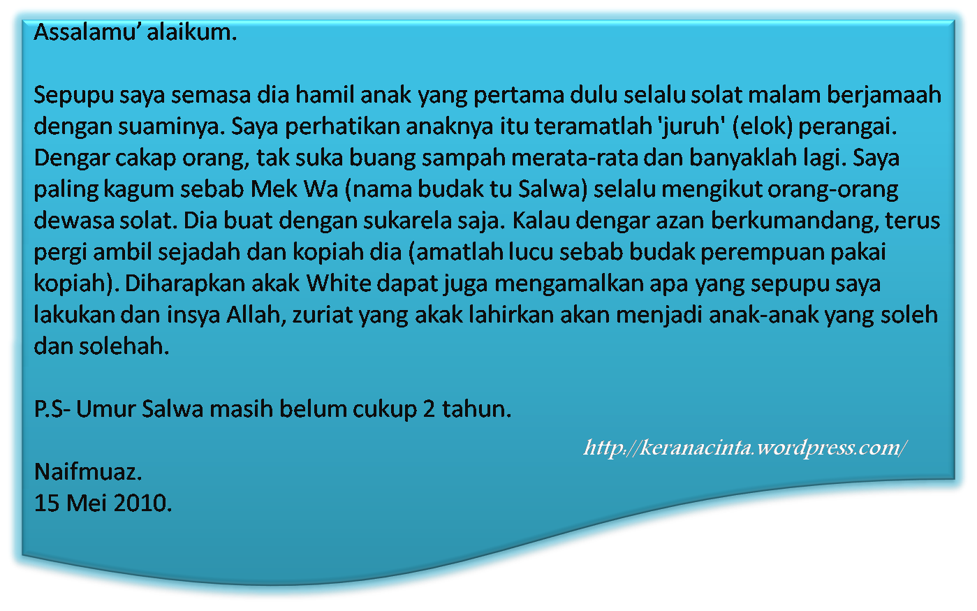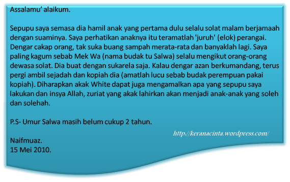 Daripada catatan Muaz di atas, saya melihat sikap Salwa yang suka memakai kopiah itu perlu diubah secara perlahan-lahan. Ia tidak boleh dibiarkan… bimbang jadi ‘Ustaz Salwa’ pula… asasnya dirinya sudah baik…moga dapat dibimbing dengan baik juga.