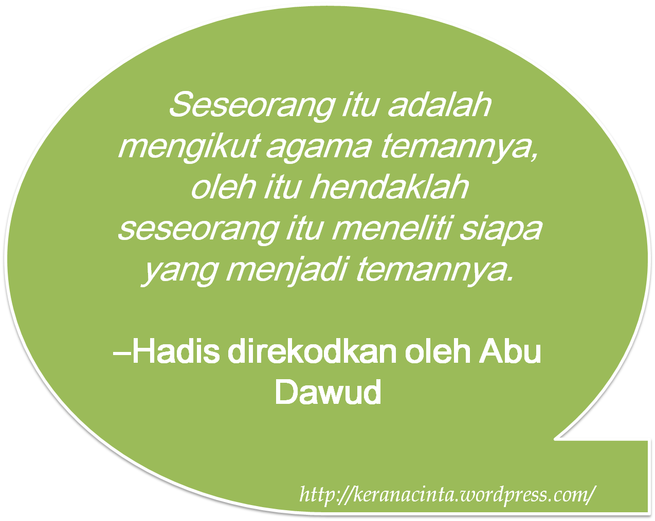 Perumpamaan berkawan dengan orang yang baik dan orang yang jahat, adalah seperti pembawa minyak wangi dan peniup dapur tukang besi. Pembawa minyak wangi, mungkin dia akan memberikannya kepadamu atau kamu akan membeli daripadanya, atau mungkin kamu akan mendapati aroma harum daripadanya. Adapun peniup dapur, mungkin dia akan membakar pakaianmu, atau mungkin kamu akan mendapat bau busuk daripadanya.