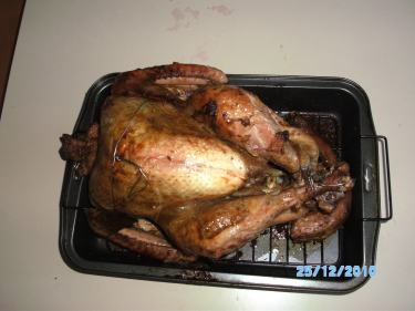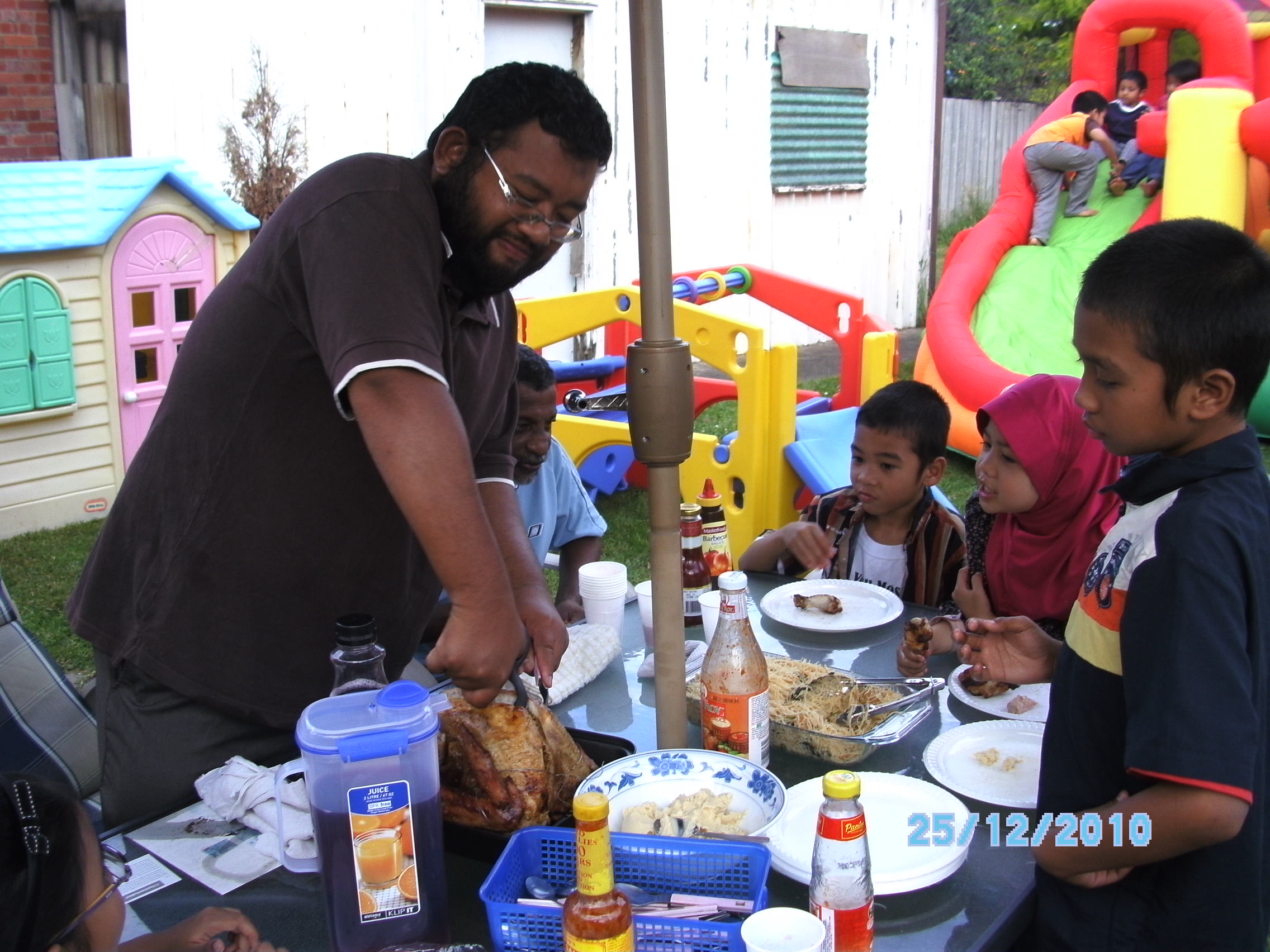 Nasib baik juga, ayam itu muat dengan oven kami. Alhamdulillah. Saya mula memanggangnya jam 5pm dan selesai jam 7pm. Tetamu juga baru sampai waktu itu. Yang mana sampai dulu membantu saya di dapur. Selain ‘turkey roast’, kami menyediakan sotong 4kg, drummette 4kg, ikan ‘yellow tail’ lebih 1kg dan sedikit sosej (baki stok dalam peti ais) untuk BBQ. Petang 25 December itu agak meriah di rumah kami. Selain itu, saya sediakan kentang goreng. Rozi pula menolong menyediakan mihun goreng dan humus.