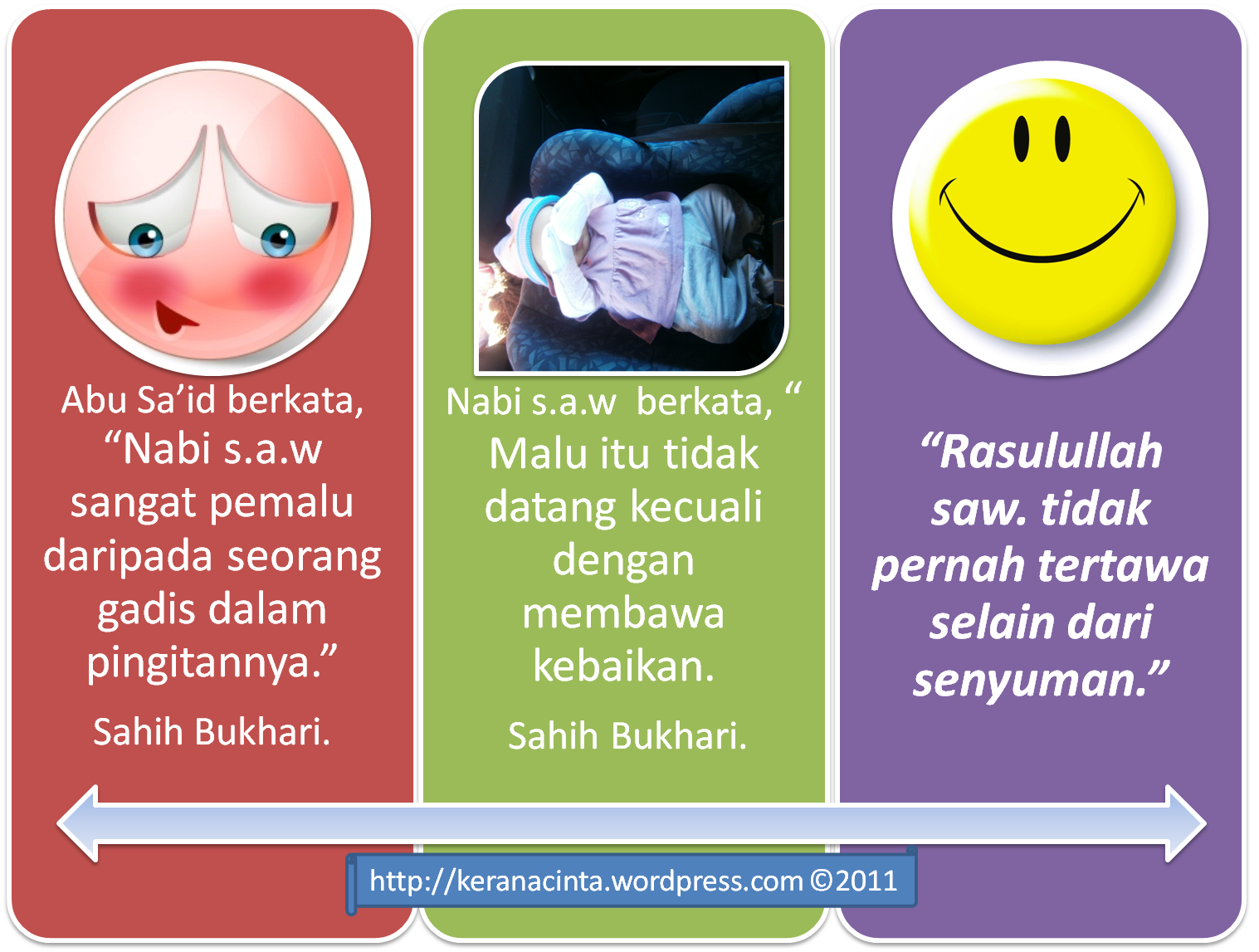 Imran bin Hushain r.a melaporkan bahawa Nabi s.a.w berkata, “ Malu itu tidak datang kecuali dengan membawa kebaikan. Direkodkan oleh Bukhari.