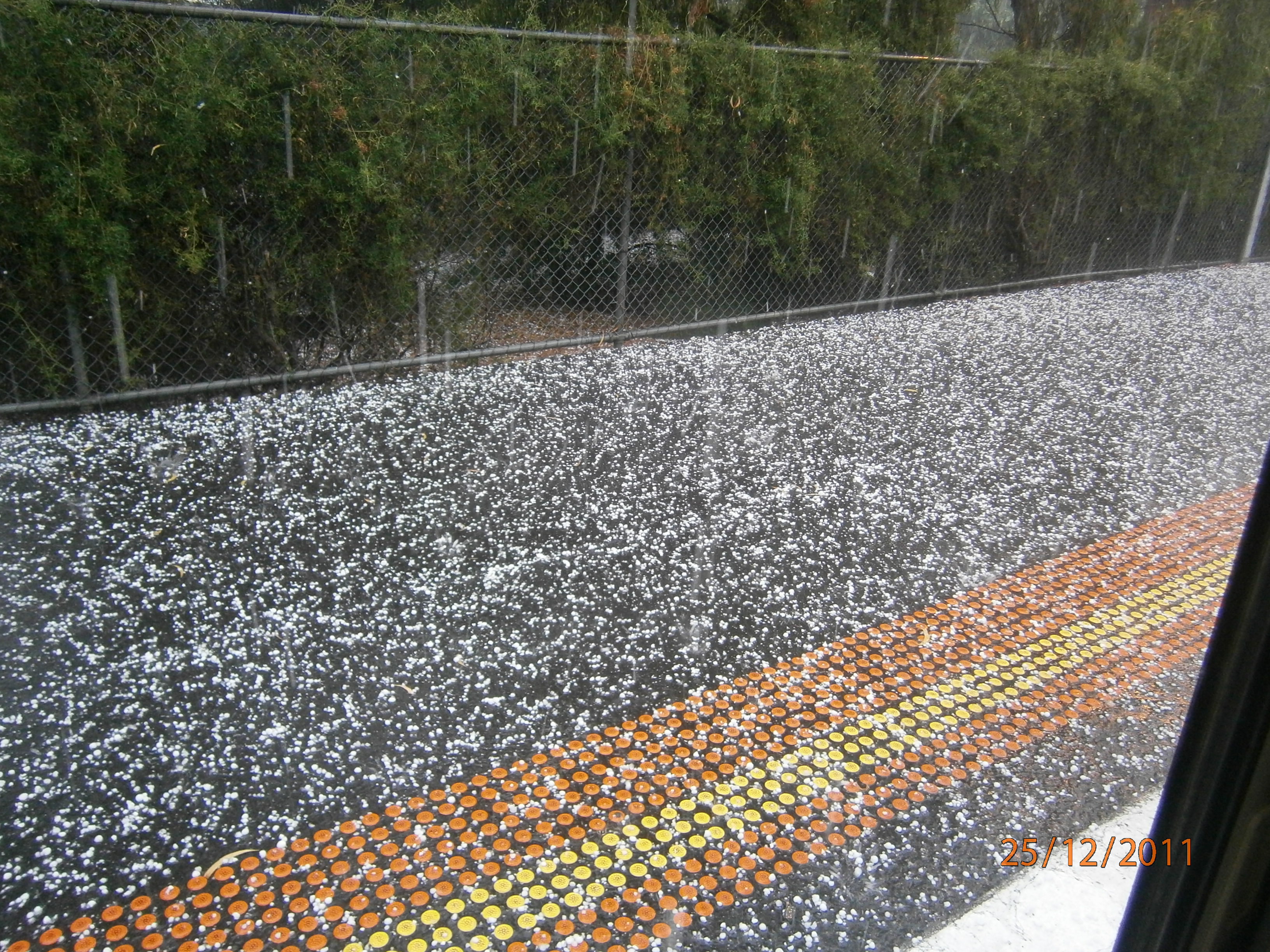Pepatah ada menyatakan, ‘Hujan emas di negeri orang, hujan batu di negeri sendiri, lebih baik negeri sendiri’. Apa yang saya dan famili saksikan semalam menyaksikan bahawa kami mengalami ‘Hujan air batu di negara orang’ dan banyak juga yang ‘lebih baik’ di sini dibandingkan dari negara sendiri. Dunia akhir zaman menyaksikan banyak perkara menjadi terbalik. Eh… saya sedang bicara isu realiti, bukan sengaja menukar pepatah tersebut. Cuba lihat foto-foto di bawah. Kami mengalami fenomena hujan air batu di musim panas semalam. Waktu ini kami berada di atas ‘train’. Biasalah, setiap kali hari Krismas di sini, pengangkutan awam adalah percuma ke mana-mana sahaja dalam Negeri Victoria. Entry mengenainya menyusul selepas ini, insya Allah.