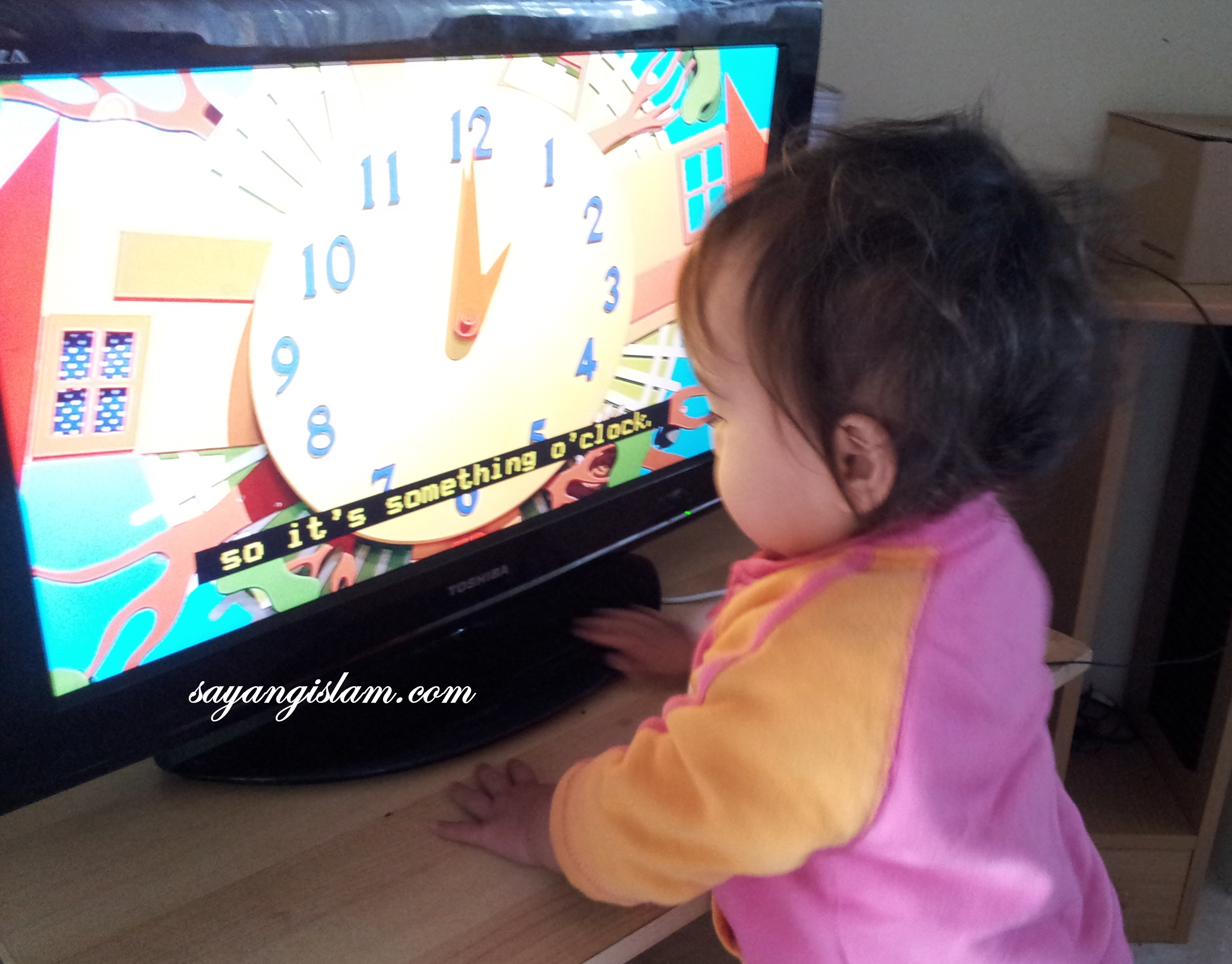 Aleeya ketika berusia setahun setengah di ruang tamu rumah di Melbourne. Ini bukan kebiasaan dia menonton dari jarak dekat ye... Kebetulan dia berdiri dekat TV, saya snap fotonya.Saya tidak perlu menunggu lama untuk beramal dengan nasihat tersebut. Tambahan pula ia ibarat ‘nanny’ yang membantu saya menguruskan rutin harian di rumah tatkala si anak ralit dengan cerita-cerita di TV. Namun seperti biasa, saya bertindak sebagai ‘Lembaga Penapis’ apa-apa sahaja cerita yang akan ditonton anak-anak. Dapur di rumah sewa kami berkonsep separuh terbuka ke ruang tamu atau ruang famili yang dijadikan ruang menonton dan bermain. Faktor ini memudahkan saya memantau keadaan anak di ruang tamu sambil membuat kerja-kerja rumah.