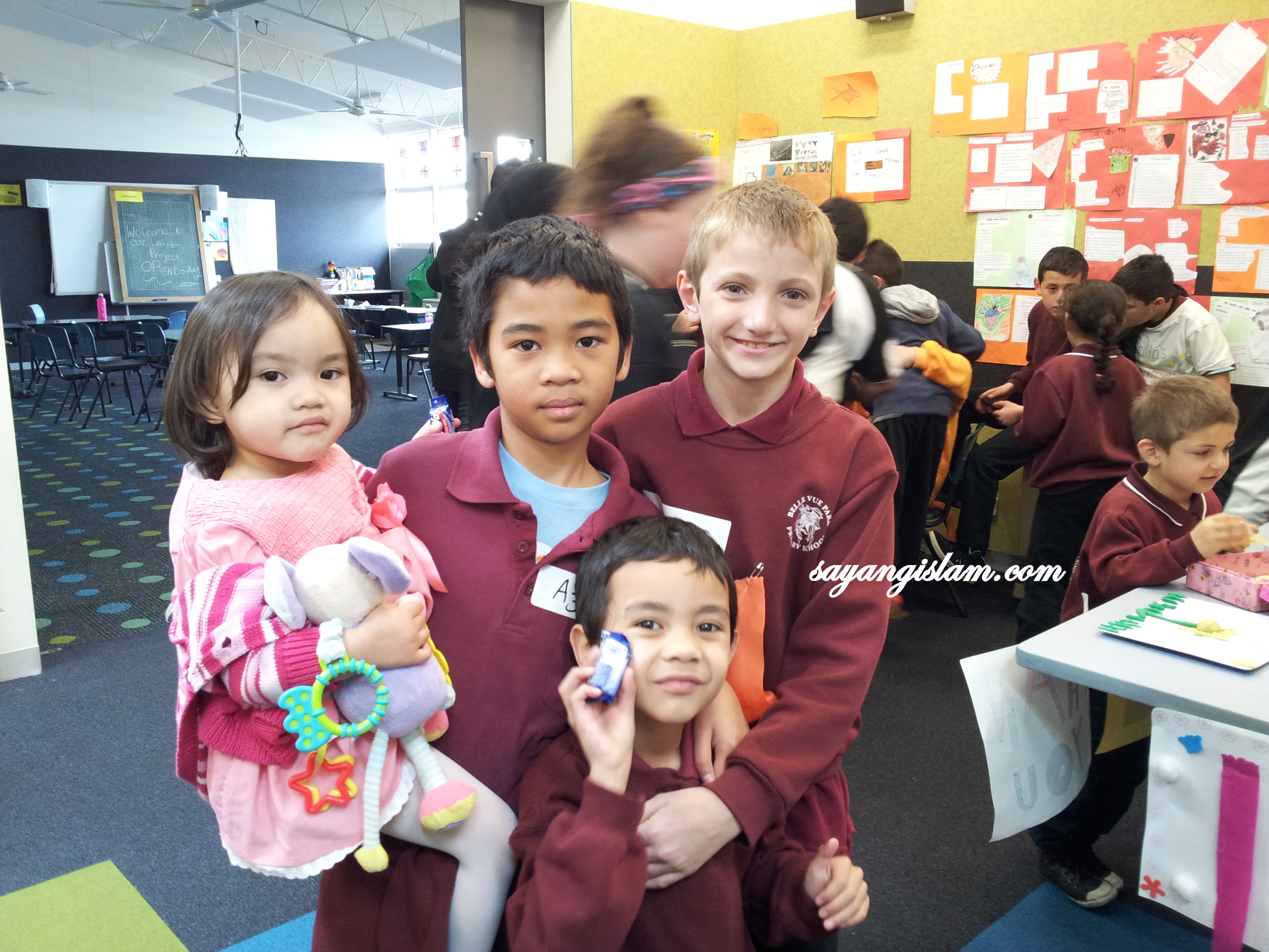 Saya, Izzah dan anak-anak perempuan duduk di satu meja. Rancaklah kami berbual walau baru setahun dua berpisah. Kami balik dulu kerana suami sudah selesai pengajiannya di Monash University, kampus Parkville. Sedang kami berbual-bual, tiba-tiba kami tertarik kepada perbualan dua orang anak yang sedang rancak bersembang juga iaitu anak sulung Izzah yang berusia kira-kira 4 tahun dan anak bongsu saya, Aleeya berusia 5 tahun. Kami sama-sama mendiamkan diri dan memberi perhatian kepada perbualan mereka yang tiada satu pun perkataan Melayu digunakan.