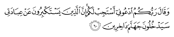 Dan Tuhan kamu berfirman: “Berdoalah kamu kepadaKu nescaya Aku perkenankan doa permohonan kamu. Sesungguhnya orang-orang yang sombong takbur daripada beribadat dan berdoa kepadaKu, akan masuk neraka Jahannam dalam keadaan hina.