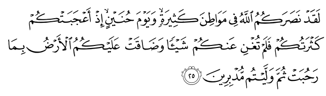Sesungguhnya Allah telah menolong kamu mencapai kemenangan dalam banyak medan-medan perang dan di medan perang Hunain, iaitu semasa kamu merasa megah dengan sebab bilangan kamu yang ramai; maka bilangan yang ramai itu tidak mendatangkan faedah kepada kamu sedikitpun; dan (semasa kamu merasa) bumi yang luas itu menjadi sempit kepada kamu; kemudian kamu berpaling undur melarikan diri.
