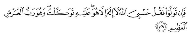 Kemudian jika mereka berpaling ingkar, maka katakanlah (wahai Muhammad): “cukuplah bagiku Allah (yang menolong dan memeliharaku), tiada Tuhan (yang berhak disembah) melainkan Dia; kepadaNya aku berserah diri, dan Dia lah yang mempunyai Arasy yang besar.”