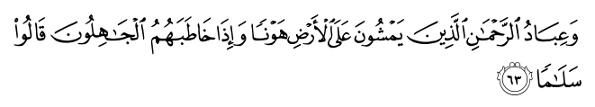 Dan hamba-hamba (Allah) Ar-Rahman (yang diredhaiNya), ialah mereka yang berjalan di bumi dengan sopan santun, dan apabila orang-orang yang berkelakuan kurang adab, hadapkan kata-kata kepada mereka, mereka menjawab dengan perkataan yang selamat dari perkara yang tidak diingini;