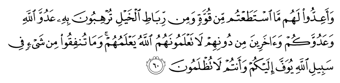 Dan sediakanlah untuk menentang mereka (musuh yang menceroboh) segala jenis kekuatan yang dapat kamu sediakan dan dari pasukan-pasukan berkuda yang lengkap sedia, untuk menggerunkan dengan persediaan itu musuh Allah dan musuh kamu serta musuh-musuh yang lain dari mereka yang kamu tidak mengetahuinya; sedang Allah mengetahuinya. Dan apa sahaja yang kamu belanjakan pada jalan Allah akan disempurnakan balasannya kepada kamu, dan kamu tidak akan dianiaya.