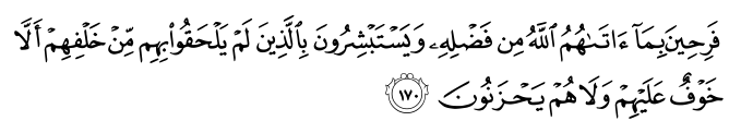 (Dan juga) mereka bersukacita dengan kurniaan Allah (balasan mati Syahid) yang telah dilimpahkan kepada mereka, dan mereka bergembira dengan berita baik mengenai (saudara-saudaranya) orang-orang (Islam yang sedang berjuang), yang masih tinggal di belakang, yang belum (mati dan belum) sampai kepada mereka, (iaitu) bahawa tidak ada kebimbangan (dari berlakunya kejadian yang tidak baik) terhadap mereka, dan mereka pula tidak akan berdukacita.