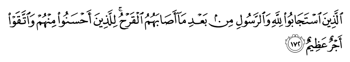 Iaitu orang-orang yang menjunjung perintah Allah dan RasulNya (supaya keluar menentang musuh yang menceroboh), sesudah mereka mendapat luka (tercedera di medan perang). Untuk orang-orang yang telah berbuat baik di antara mereka dan yang bertaqwa, ada balasan yang amat besar.